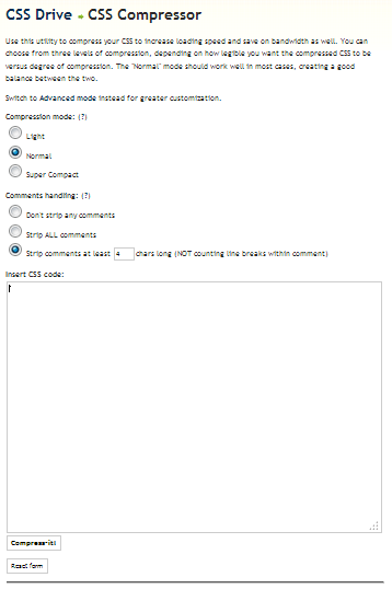 موقع احترافي يقدم ثلاث مستويات لضغط اكواد الـ CSS و هي Light و Normal و Super Compact عليك استخدام المستوى العادي Normal اما التعديل الثاني متعلق بالتعليقات اتركه كما هو، اخيرا ضع كود css داخل اطار و ضغط على compresse – it موقع سهل الاستخدام و لا تجد امور معقدة ينصح باستخدامه .